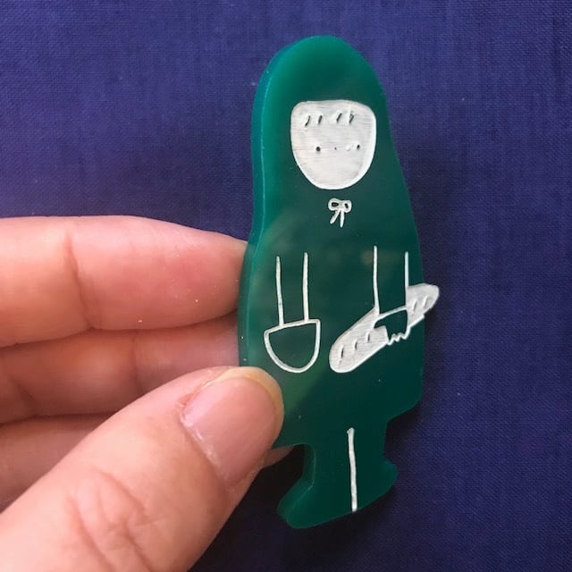 パンを持った女の子のブローチ(みどりアクリル)です。すこし透け感があります。 縦72mm、横32mm、厚さ3mm。
